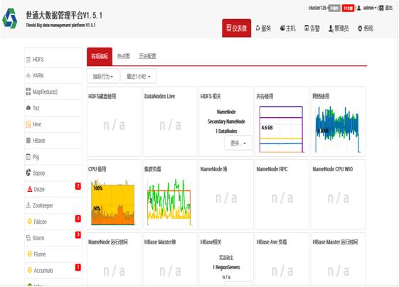 集群服务包括: HDFS、YARN、Mapreduce2、 Spark、Tez、Nagios、Ganglia 、Hive、HBase、Sqoop、ZooKeeper、HugeTable等。同时,通过接口可实现二次开发,以满足业务深入定制需求,让企业数据应用一目了然。